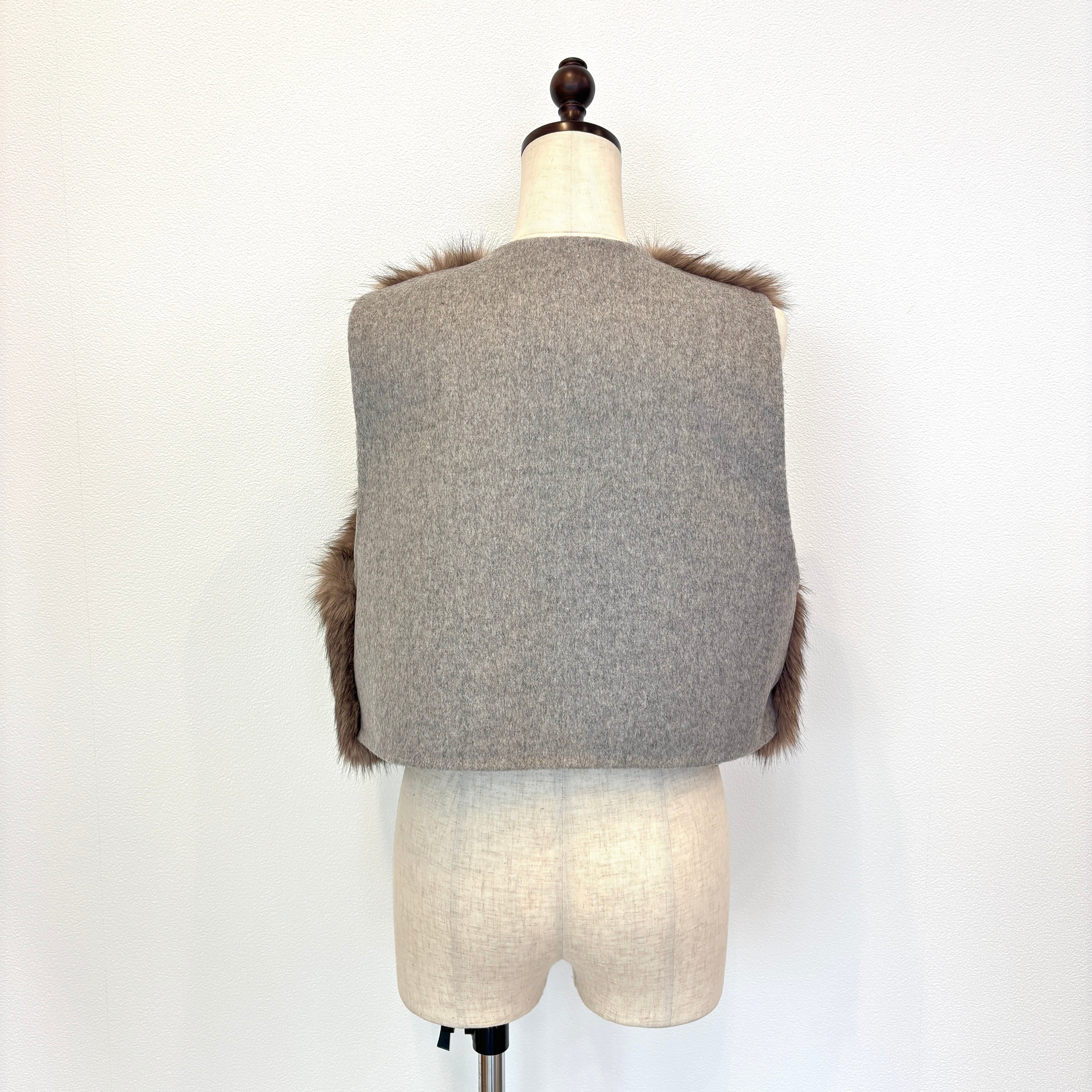 フロントがフェイクファー バックはフエルト生地のような 暖かみのある生地となった ドッキングデザインのベスト。 両面とも心地よい肌触り♪ すっきりとしたショート丈で軽い! どなたもスタイリングしやすいベストです。 【素材】布帛 ウール50% ポリエステル50% 裏面 ポリエステル100% 【カラー】グレー 【サイズ】フリー 肩幅(㎝)38/身幅52/着丈48