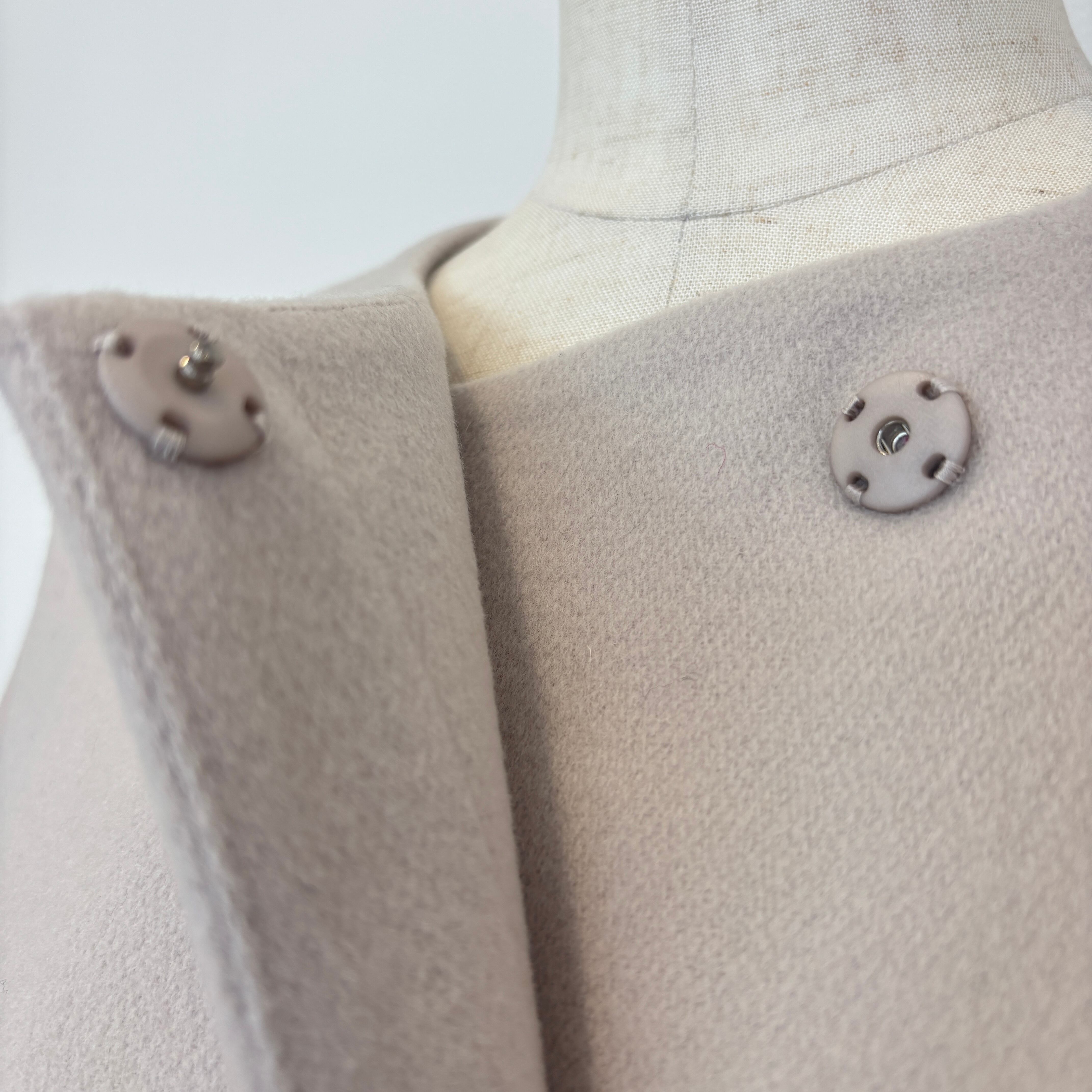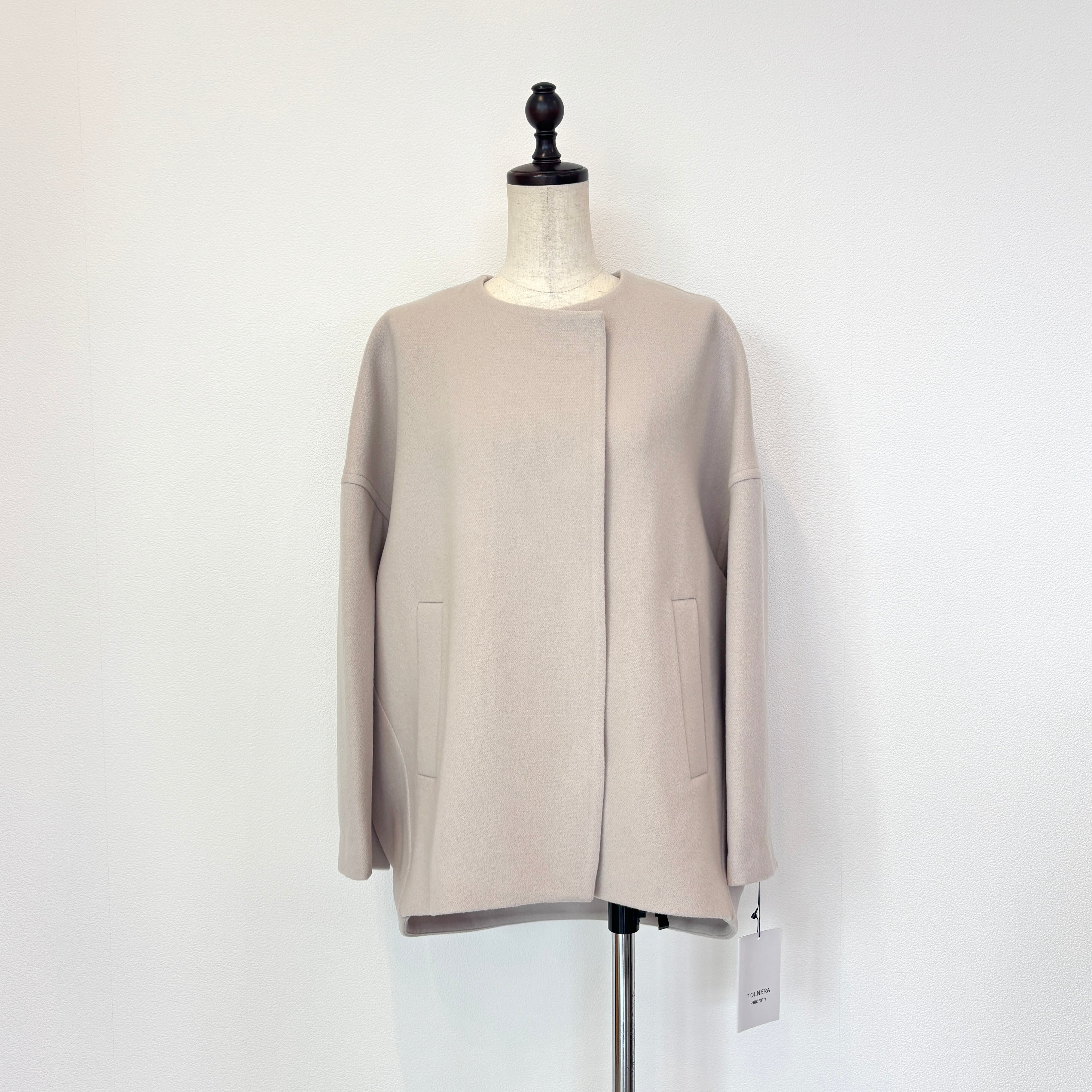 淡い上品カラーのウールコート。 軽くて暖かく、チクチク感は無く 裏地付きで着脱もスムーズ。 ゆったりとしたサイズ感の ノーカラーデザインは きちんとスタイルはもちろん、 パーカーにONしたカジュアルスタイルにも◎ 【素材】毛95% ナイロン15% 裏地 ポリエステル100% 【カラー】エクリュ 【サイズ】38 フリーサイズ 裄(㎝)82/身幅64/着丈68/72