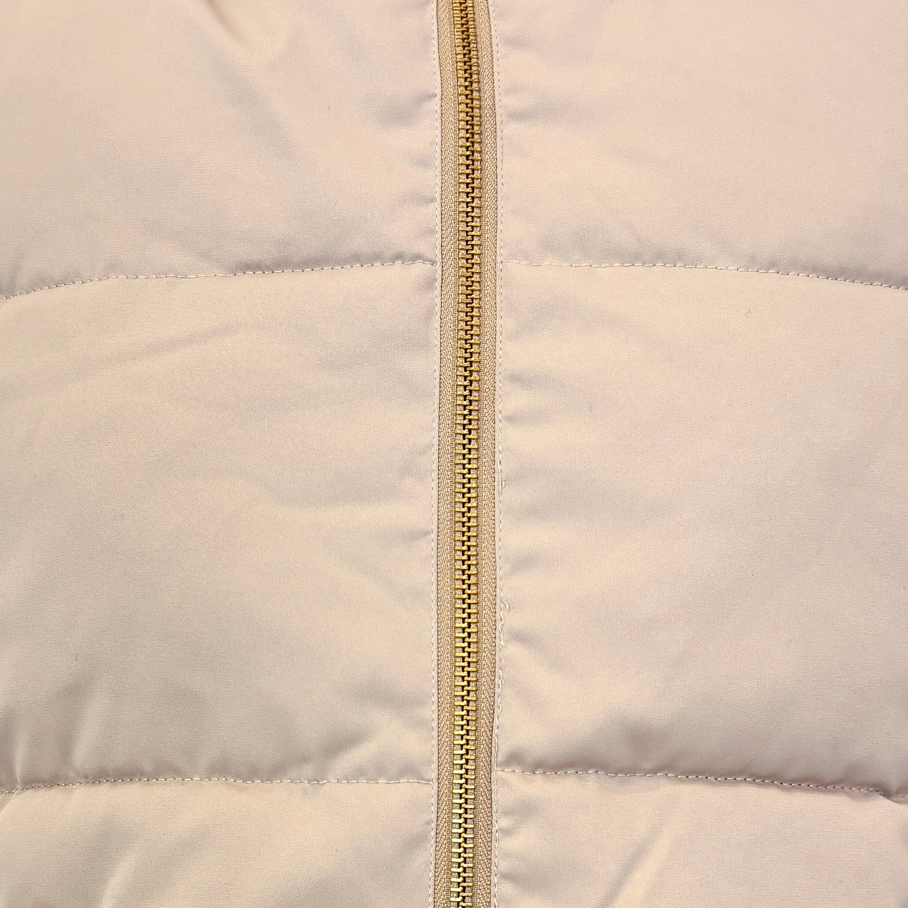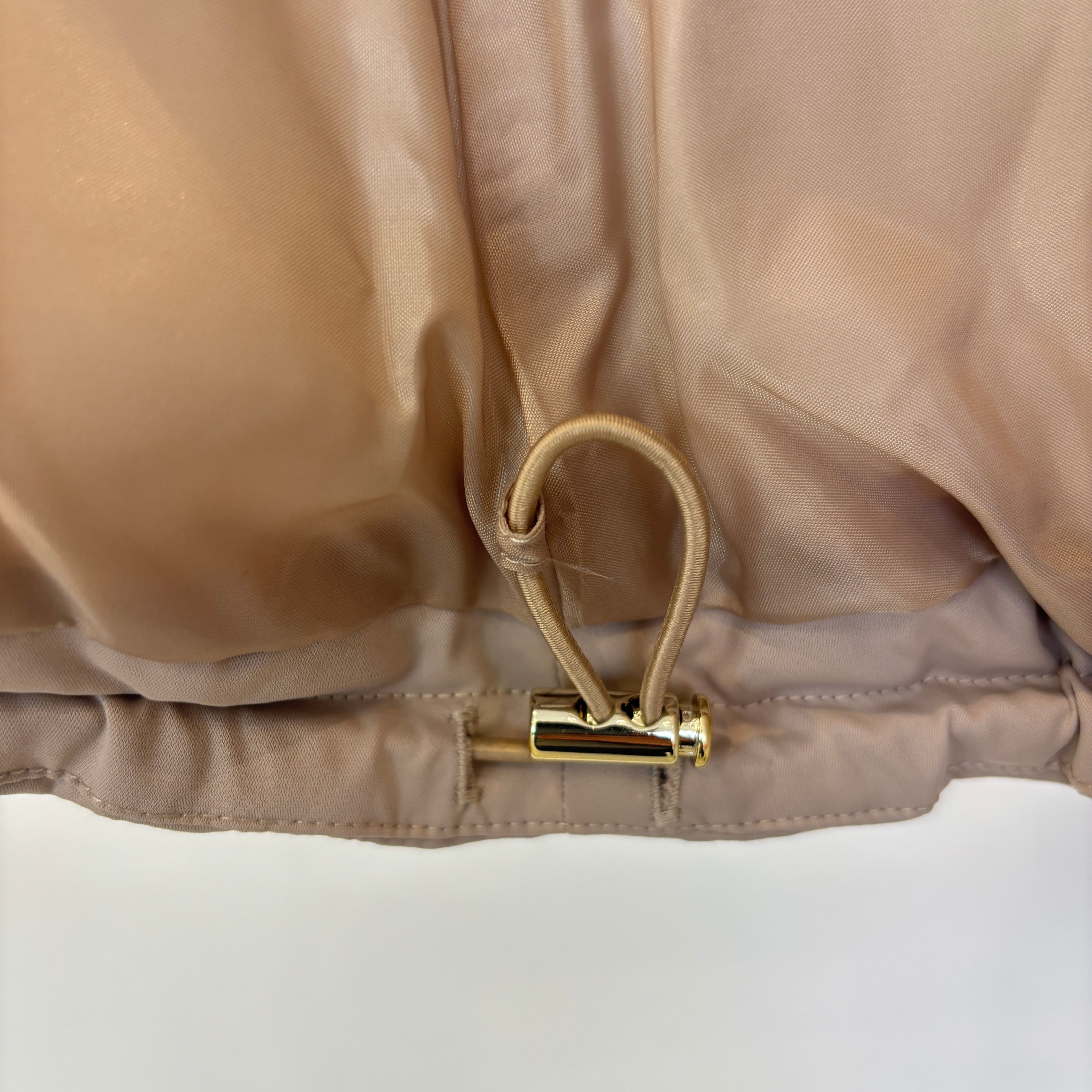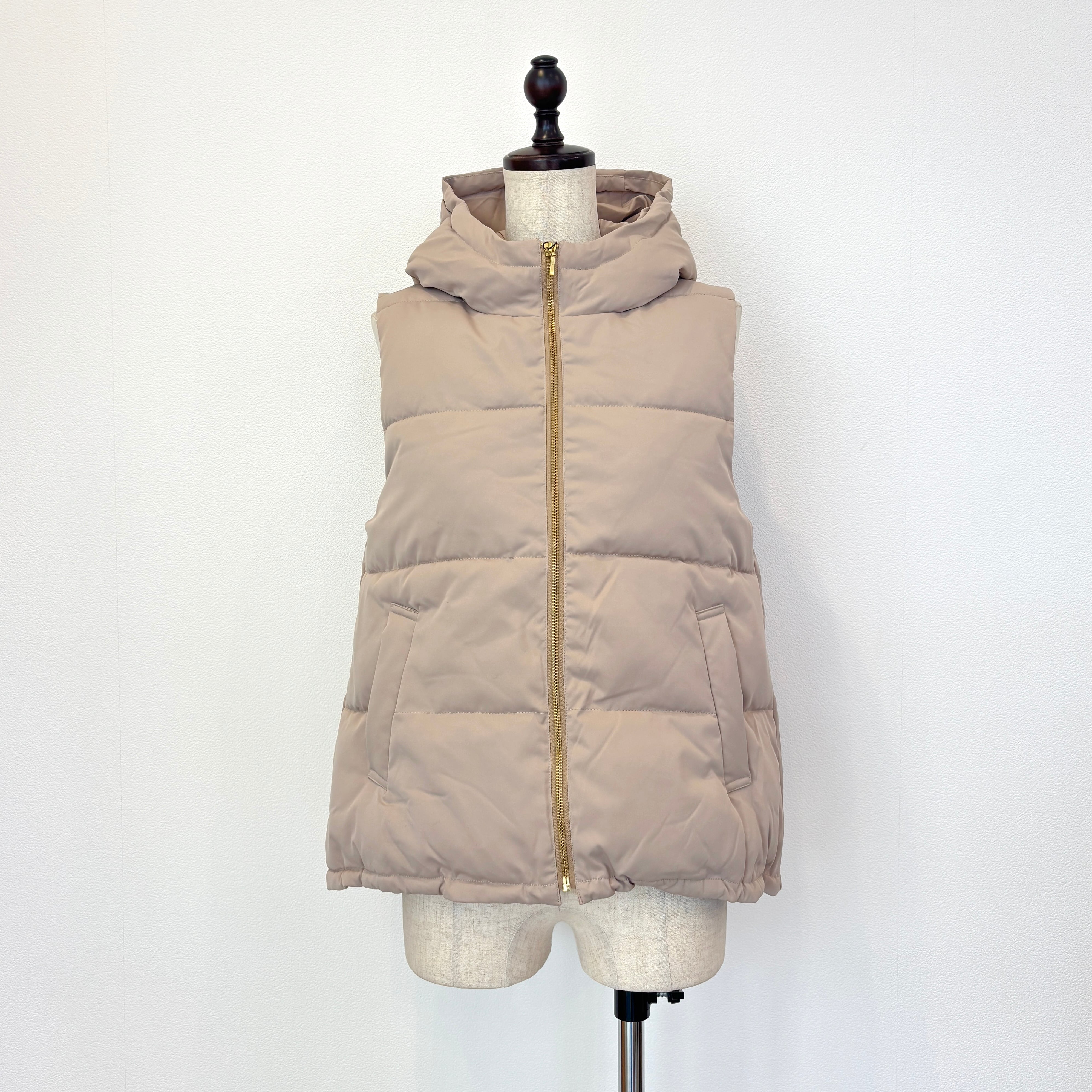 ふっくらと暖かみのある マイクロファイバーダウン仕様したベスト。 お尻にかかる程の着丈で 裾はギュッと絞れるドロスト仕様で すっきりとしたスタイリングが叶います! カラーがベージュなので春アウターとしても 着用出来ます♪ 【素材】表地、裏地、詰物 ポリエステル100% 【カラー】ベージュ 【サイズ】M 肩幅(㎝)37/身幅50/きた59/63