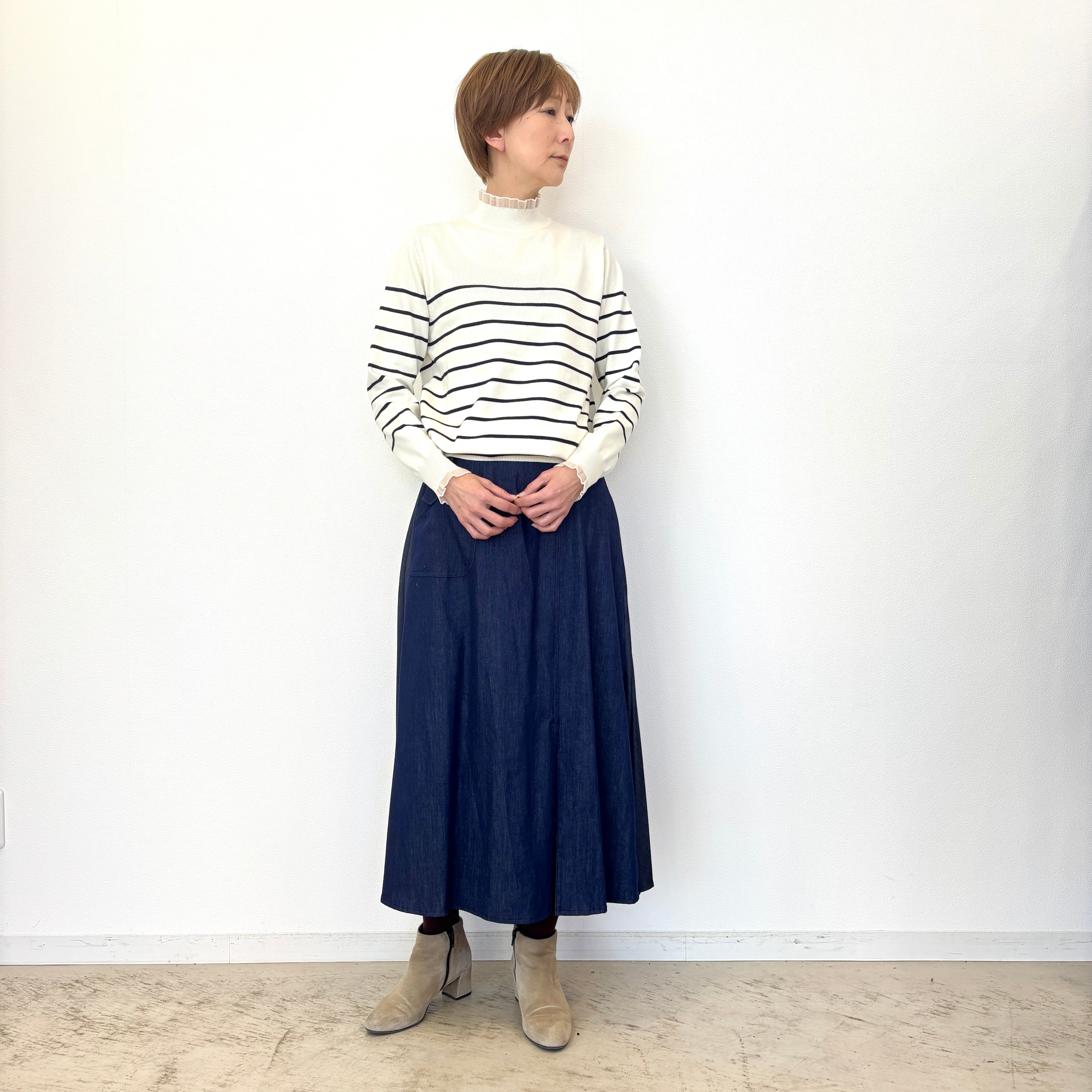 ハイネックボーダーニット。